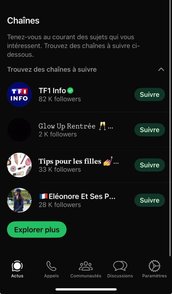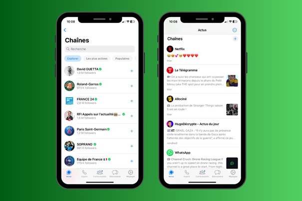 En 2023, WhatsApp a sorti une nouvelle fonctionnalité : l’envoi de contenu sur des “chaines”. Ce sont des espaces de diffusion unidirectionnels, qui permettent d’envoyer un même message à plusieurs destinataires simultanément. Seul l’administrateur peut publier. Les abonnés à la chaine reçoivent les mises à jour dans un onglet spécifique, appelé “Actus”, séparé de leurs discussions privées.