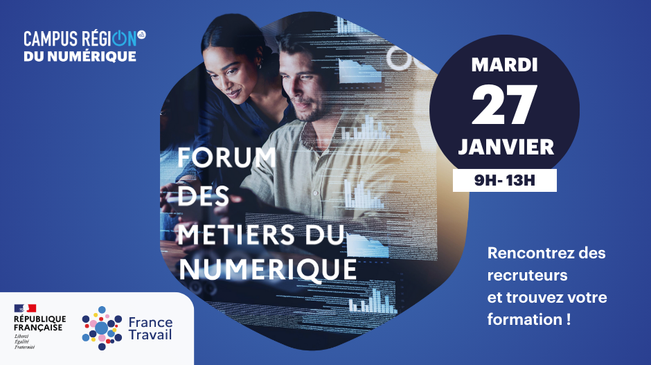 Le Forum des métiers du numérique, co-organisé avec France Travail, est de retour au Campus Région du numérique le mardi 27 février de 9h00 à 13h00 !